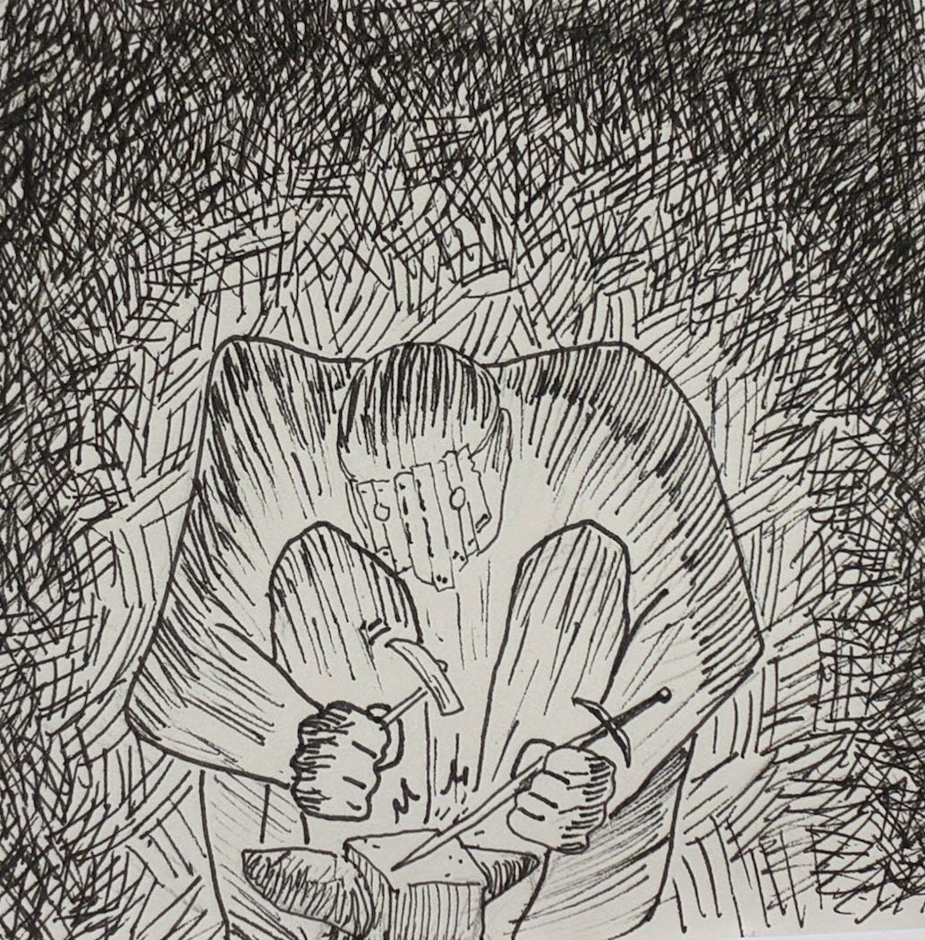Area 4. UD: 8. 2 doorways. Fortune: Valuable reward. Scenario: Darkness. Interesting after just discovering a lantern. Encounter: Giant. Quirk: Slumbering. Curse: Shadowvoid, darkness (again). Since this is my own game where i want to invoke a direct Souls fee, this giant is a straight up blacksmith. Oracle: Is he chained? No.The room after the bridge is pitch black. Slow deep breathing, like a massive bellows, can be heard inside. Ilphas’ Abyss Ring brings it all to life in monochrome. A giant is sleeping, curled around an anvil and cold fire pit. Ilphas opens the lantern to let the red gaze of the Chaos Skull Lantern illuminate most of the room and the giant snuffles and turns. He coughs and raises himself to a sitting position. A very deep, yet muffled voice issues from behind his wooden mask. “Oh! Hello there! Fancy you bringing a light into my smithy. Just what I needed!” He leans closer to get a better look at the lamp. “Tell you what, wandering pilgrim, you give me that lamp and I will fashion fine weapons and armour for you. What do you say?”